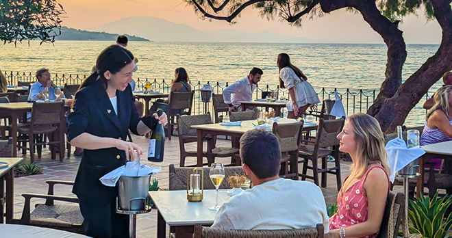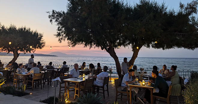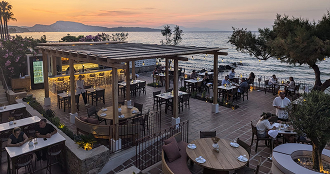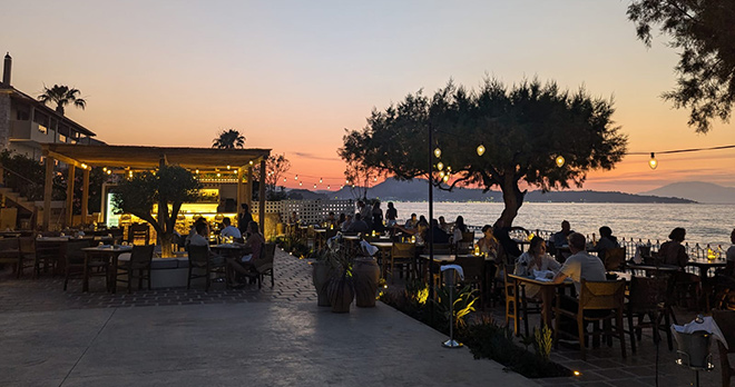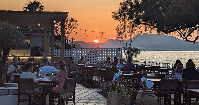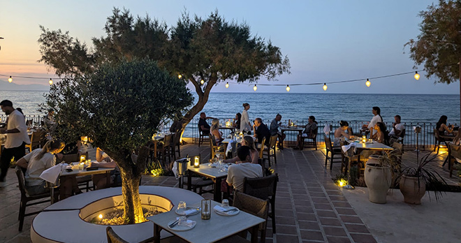Cenare qui al Nima di Argassi significa avere un servizio impeccabile, il suono del mare, una musica leggera di sottofondo e le luci di Zante town che in lontananza si accendono al tramonto.